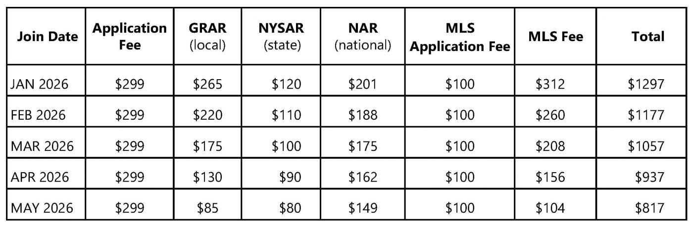 Dues and fees are pro-rated for the remainder of the time between your join date and the end of our billing cycle (June 30th). See the chart below for current year dues and fees, and contact our Member Services team with additional questions at 585-292-5000 or GRARHelpDesk@grar.net.